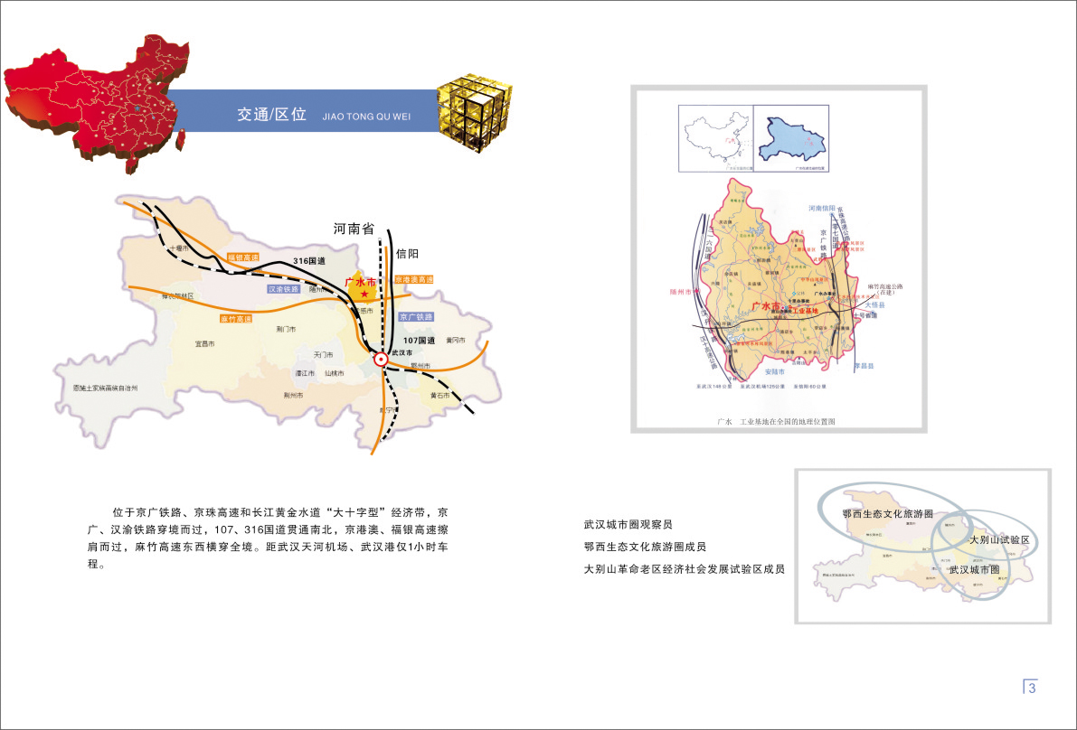 ????? 廣水市位于湖北省北部偏東,因有全國八大名關之一的武勝關而名揚四海,素有“鄂北門戶”之稱。京廣鐵路和107國道在東部縱貫南北,漢丹鐵路和316國道在西部并駕齊驅,京珠高速公路和漢十高速公路從東西兩側擦肩而過,10號省道從中部橫穿東西,挑兩線四路于一體,形成縱橫交錯、四通八達的交通網絡。從這里到武漢天河機場僅1個多小時的路程,交通十分便捷。