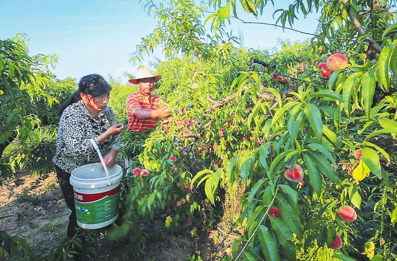 ??眼下正是胭脂紅桃采摘上市的時節。記者來到位于廣水市十里街道墩塘村的胭脂紅桃基地,只見桃林郁郁蔥蔥一望無際,青枝綠葉間,桃熟紅如火,累累壓枝低。65歲的村民王立學和老伴、哥哥正在桃林里采摘鮮桃,個大飽滿鮮紅的桃子裝滿了兩籮筐。他告訴記者,今年的桃子品質好,價格也不錯,他的桃子主要是以3元每斤的價格賣給上門收購的商販,也有部分現場采摘和網銷。由于桃子大量成熟,采摘期只有10多天,他們每天凌晨1點多就起來采摘,十分辛苦。但累并快樂著,“我家25畝桃園已經賣出4萬多斤桃子,進賬12萬多元。”老漢臉上露出幸福的笑容。