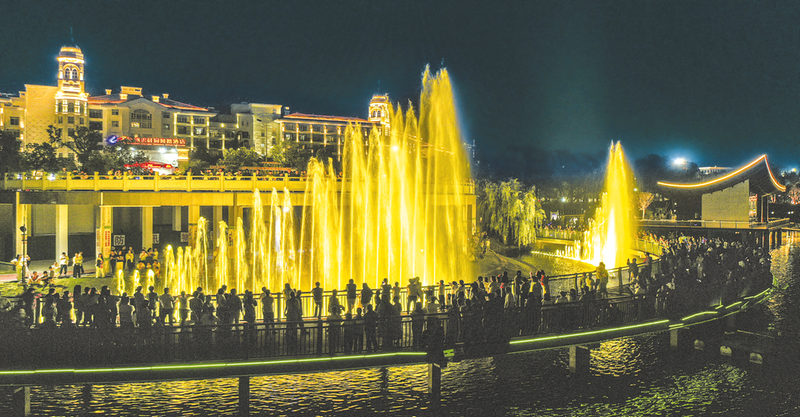 圖為市民正在白云湖畔觀賞音樂噴泉 (隨州日報全媒記者李文軍攝)