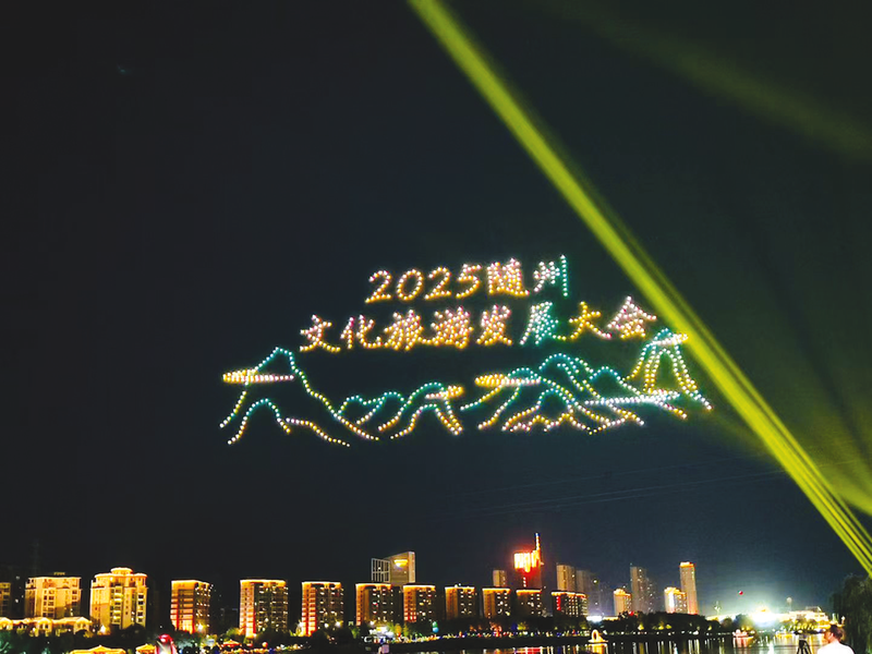 當晚的白云湖,光影掩映,絢爛無比。兩岸樓體動態展示炎帝神農、曾侯乙編鐘等圖案,和現場光束組合成震撼燈光秀;無人機表演以光影勾勒出編鐘、銀杏等造型,與地面燈光秀呼應。