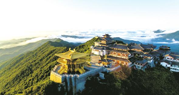 山高人為峰。大洪山主峰寶珠峰,海拔高度1055米,被譽為“楚北天空第一峰”。在這里,可以一覽眾山,任思緒飛揚;可以臨風而立,任衣衫飄飄;可以登臨金頂,夢回千年唐宋。當云翻霧涌的時候,各種仿古建筑群忽隱忽現,猶如置身天上宮闕,定會有“不知今夕是何年”美妙錯覺。