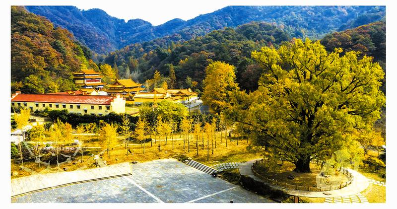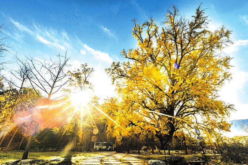 每當到了秋天,樹葉像黃金般掛在枝頭鮮艷奪目,為了給這株千年古銀杏壯威增色,景區在千年銀杏古樹周圍栽了百余株銀杏樹,這里變成了一片金色的世界。在中國人的審美情趣里,黃色具有光明、華美、富麗的意義,它是輝煌的象征,是美好事物的體現。
