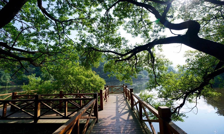 如今在靠南山的水邊建起游步道,人們可以穿行在虬干曲枝的楓楊林中,欣賞波光粼粼的湖面,感受蒼翠繁茂的森林境界,眺望大洪山主峰,真有神清氣爽的感覺。