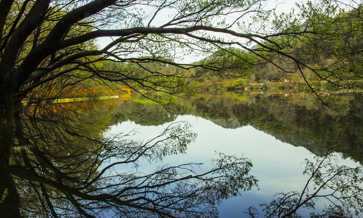 夏日的白龍池平靜如鏡,湖水干凈清澈。四面高山環抱,山勢險峻。山林景致幽深,環境隱秘而寧靜,有如仙境一般。