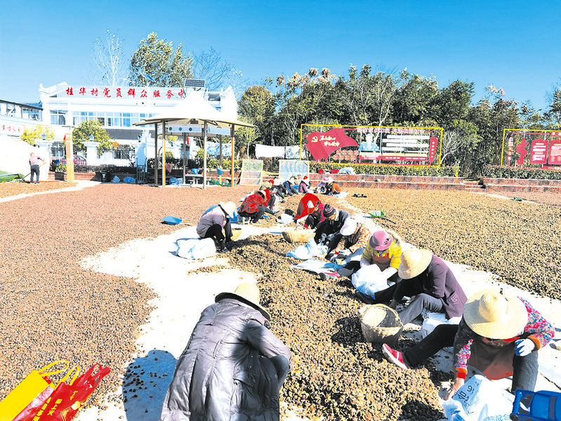 登上山頂放眼望去,層層疊疊的種植平臺上,一株株油茶樹碩果滿枝,農戶們正忙碌采收油茶果。 ?