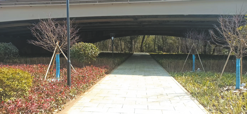 在該項目現場負責人的帶領下,記者一行沿著新修建的游步道步行,下穿涢水一橋,就來到了白云公園,兩個公園之間綠意盎然,地形自然過渡,毫無違和之感。
