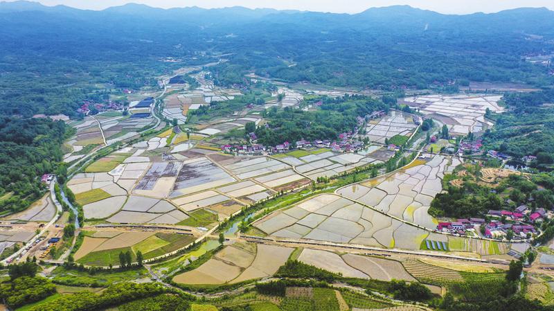 5月中旬,記者航拍隨縣洪山鎮鄉村田野。村民搶抓農時,整田、灌水、插秧,一片繁忙的勞作景象。層層梯田在陽光照耀下泛著片片銀光,與縱橫阡陌、農舍,組成一幅幅美麗的田園畫卷。