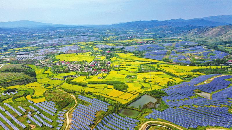 山頂一片片風力發電機葉片隨風轉動,山坡上一排排光伏電板熠熠生輝,山下一片片稻菽千重浪。近年來,隨縣殷店鎮大力發展風力、光伏發電等新能源產業,全力打造新型能源產業示范鎮。目前,全鎮已形成由華潤風電、華電光伏、鴻錦新能源燃氣為支柱的新能源產業。圖為位于殷店鎮雄峰村的華電集團光伏電場。?