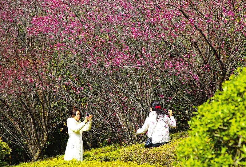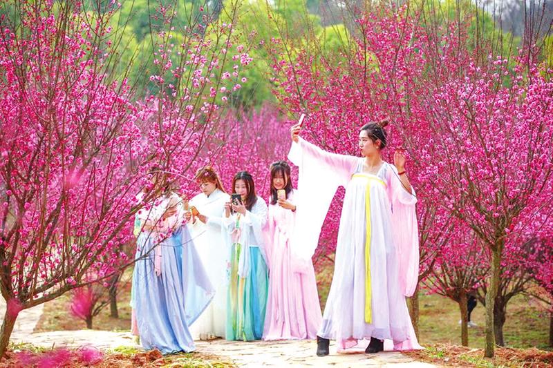 在炎帝故里景區梅園,梅花綻放花枝俏,花朵層層疊疊、嚴嚴密密。游客絡繹不絕,賞花、踏春、拍照打卡,隨手一拍,均是一幅畫。