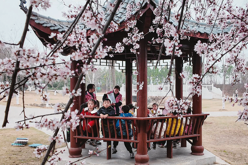 曾侯乙墓遺址公園里,杏花肆意綻放。花團錦簇之中,古色古香的木亭里,歐陽修幼兒園的孩子們在老師的引導下,奶聲奶氣地背誦著《弟子規》,圍著杏林嬉戲感受春天戶外的快樂。