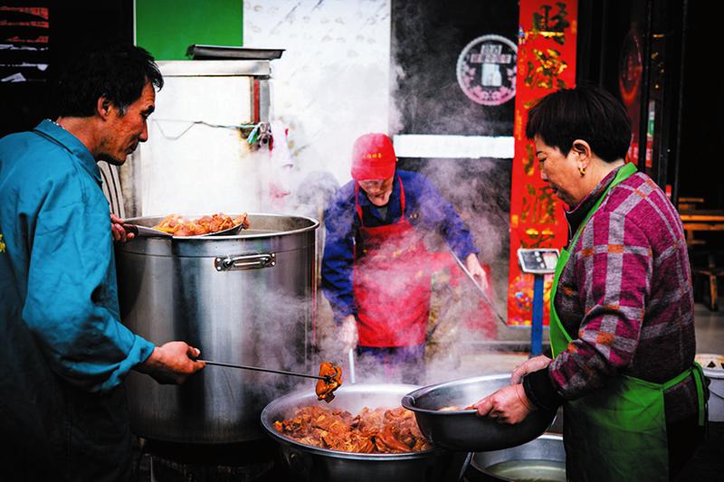 鹵制豬腳的鹵料配方和制作工藝都十分講究。廚師們將精選的豬腳剔除豬毛、分成小段、焯去血水、開水復(fù)沸、清水沖洗,每道工序都不敢馬虎。最關(guān)鍵的是鹵制環(huán)節(jié),第一步是炒精醬,廚師們用白糖、醬油等在鍋中反復(fù)翻炒至濃稠,迅速將豬腳倒入其中炒至上色;第二步是慢鹵,將上色后的豬腳與精心挑選的20余種純天然中藥藥材一起放入高壓鍋壓制1個半小時,緊接著將鹵煮入味的豬腳轉(zhuǎn)入小鍋用文火繼續(xù)燉煮,再次調(diào)味,歷經(jīng)10余個小時烹制,拐子香氣撲鼻、軟糯脫骨,才算完成制作。鹵煮過程中的“老鹵”十分關(guān)鍵,“老鹵”吸收了每一次鹵制后存留的老湯精華,根據(jù)需要再添加適量新的鹵料,保持口味純正。 ?