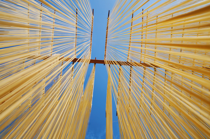縱橫交錯的掛面架上,雪白的奎面層層疊疊,如珠簾一般打散了光影。制面師傅在其中來回穿行,影影綽綽中呈現(xiàn)著豐收的喜悅。