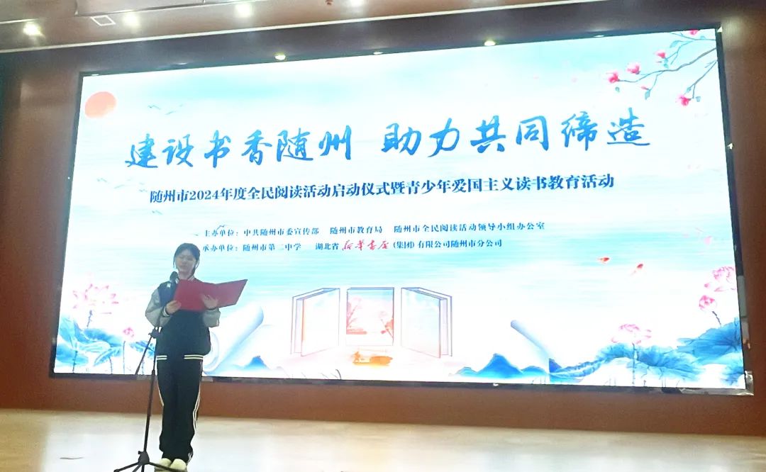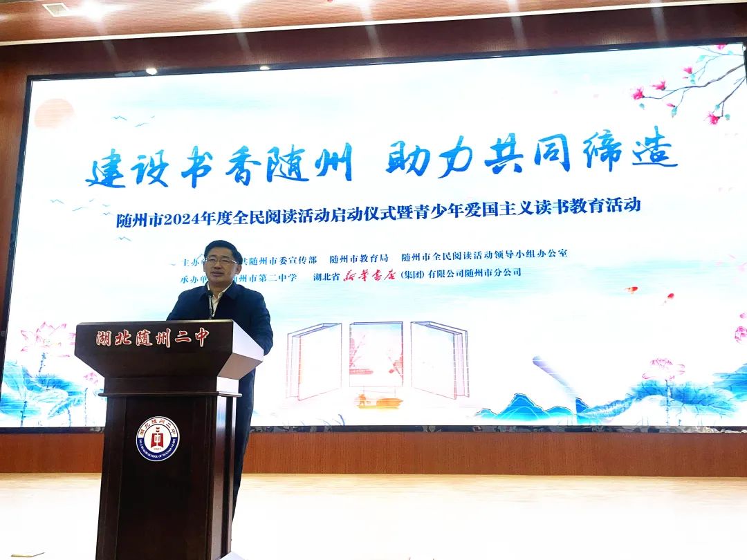 4月17日,隨州市 2024 年全民閱讀活動啟動儀式暨青少年愛國主義讀書教育活動在隨州市二中舉行。市委常委、宣傳部部長羅棟梁出席并講話。今年的閱讀主題為“建設書香隨州 助力共同締造”,啟動儀式上,開展了經典誦讀展演、宣讀了閱讀倡議書、在全民閱讀知識問答中增加“掃黃打非”知識呼吁大家參與,活動現場氣氛熱烈活躍,激發起濃烈的閱讀氛圍。市新華書店還向師生們捐贈了100張讀書券,進一步推廣全民閱讀,助力素質教育。