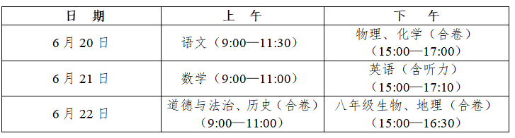 (五)考試時間的調整:九年級學生的文化考試科目語文、數學、英語、物理和化學(合卷)、道德與法治和歷史(合卷)的考試時間調整為6月20日上午—22日上午,八年級學生地理、生物考試調整到6月22日下午。