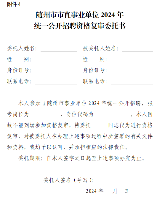 4.隨州市市直事業單位2024年統一公開招聘資格復審委托書