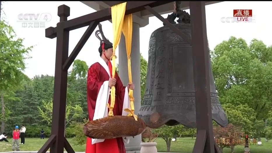 王蒙徽緩步上前,面向圣殿鞠躬后,推動“扶犁”。大殿圣門緩緩開啟,炎帝神農圣像顯現在海內外炎黃子孫面前。現場行“三獻禮”,以“享酒”“五谷”“玉帛”祭祀炎帝。