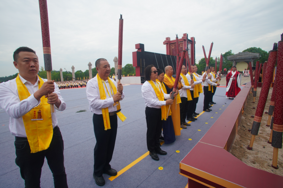 歲次甲辰,時在孟夏。九州太平,四海清嘉。華祖門前,排仗迎迓,行禮如儀,恭迎海內外炎黃子孫謁祖尋根。在炎帝神農故里照壁處,嘉賓們整理衣冠,佩戴黃絲巾,在幡旗方陣和奉祀方陣的引導下,經過四牛耕作石雕、九拱橋、華夏始祖門、圣火臺、七步登天臺,行至莊嚴肅穆的謁祖廣場,面向炎帝神農大殿肅立。