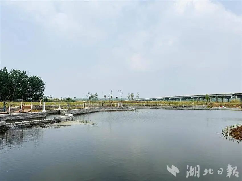 6月6日,湖北日報全媒記者走進這片人工濕地,沿著休閑步道游覽,黃菖蒲、黃花鳶尾等植物栽種成片,溢流堰處流水潺潺,仿佛一座小型的城市公園。