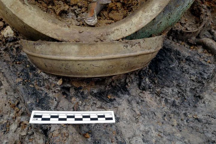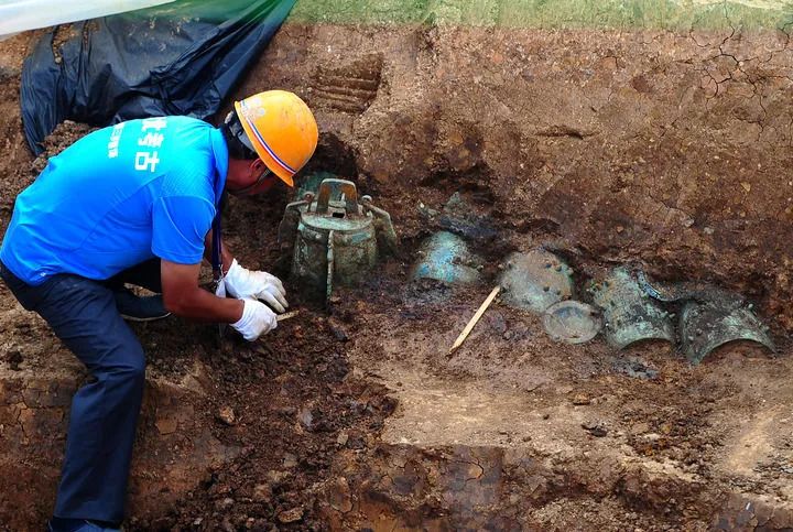 2013年7月4日,在M111墓葬內,工作人員在對編鐘進行挖掘工作。新華社記者肖藝九攝出土編鐘的是M111曾侯犺墓,也是目前湖北所見西周早期墓室規模最大、出土文物最多的墓葬。原址保存展示的甲字形墓坑連著體現等級的墓道,墓坑內的二層臺面上,擺放著1個镈鐘、4件甬鐘,以及銅簋等器物的1:1復制件,還原出一座大墓剛剛掀開面紗的原貌。