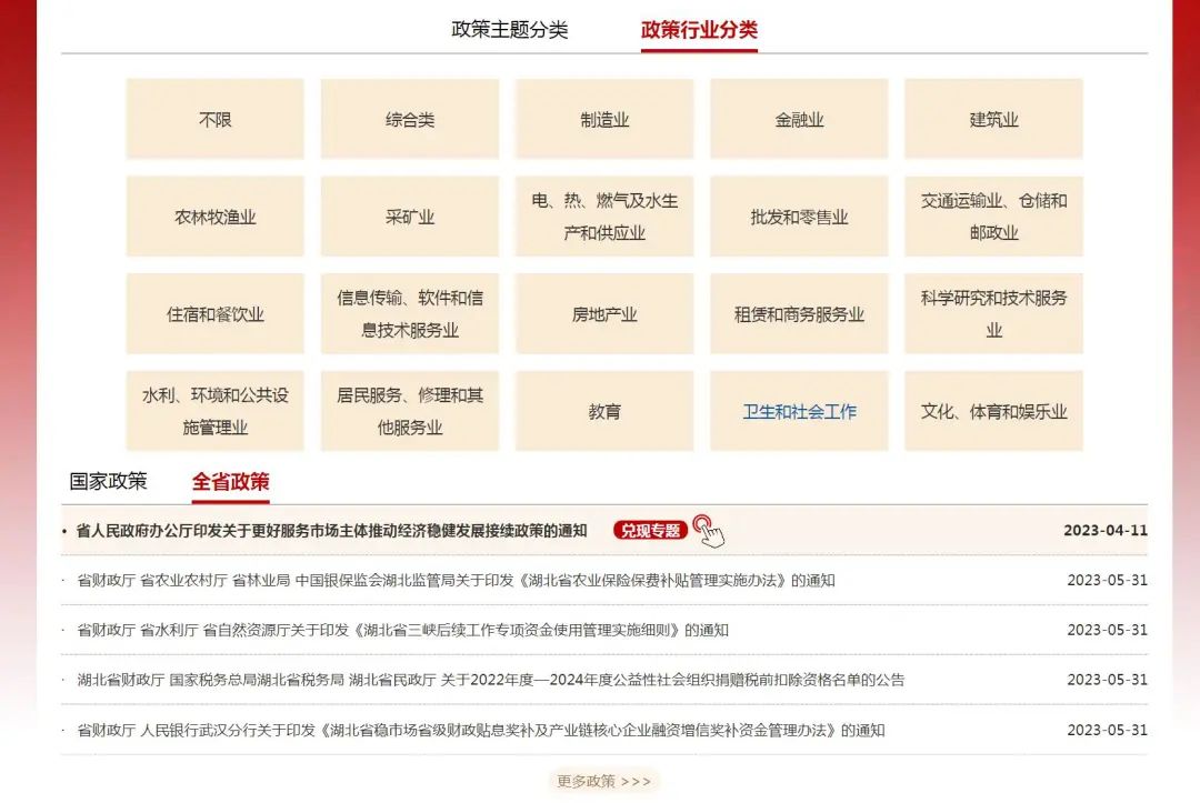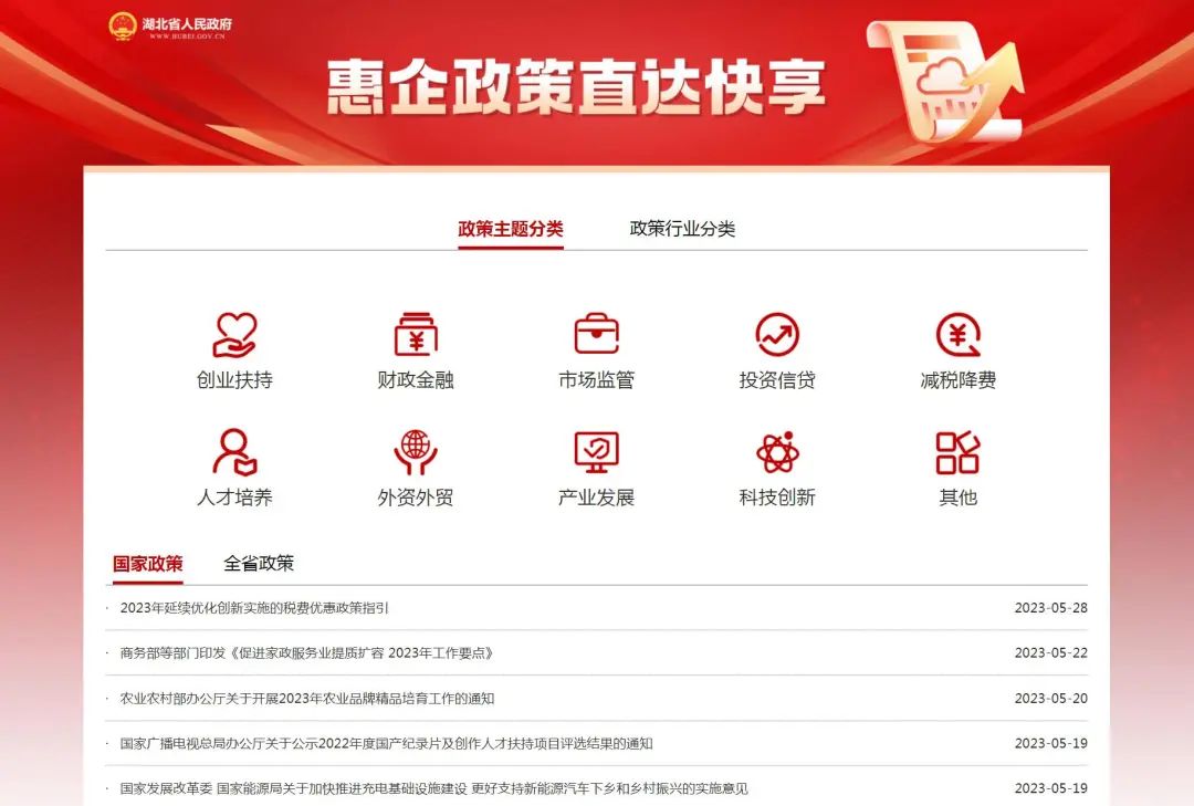 專區(qū)匯集了國家和湖北現(xiàn)行有效惠企政策文件,設(shè)置了創(chuàng)業(yè)扶持、財政金融、減稅降費、人才培養(yǎng)、科技創(chuàng)新等10大主題分類,以及制造業(yè)、建筑業(yè)、農(nóng)林牧漁業(yè)、批發(fā)和零售業(yè)、住宿和餐飲業(yè)等19個行業(yè)分類。您可以按政策類型、所在行業(yè)進(jìn)行篩選,查看所需的政策文件。