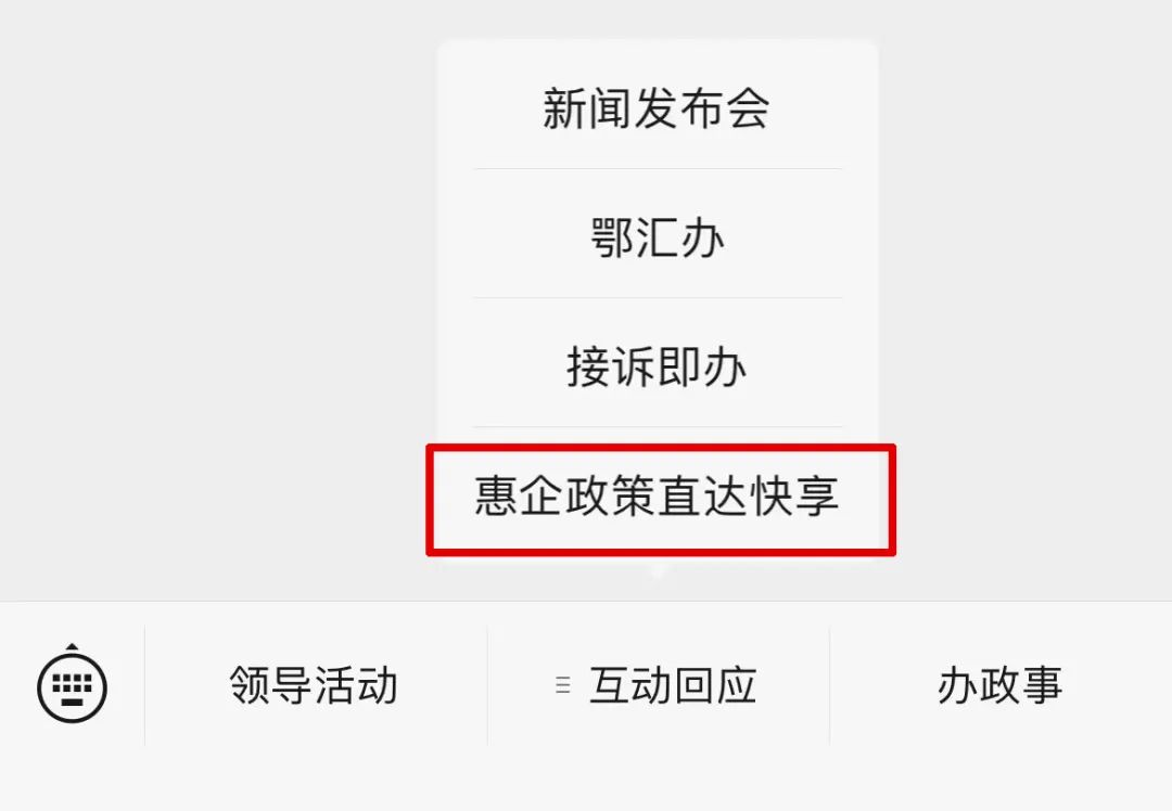 方式三:關(guān)注“湖北省人民政府門戶網(wǎng)站”微信公眾號,在菜單欄點擊“惠企政策直達(dá)快享”即可進(jìn)入。