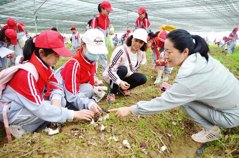 近日,8輛大巴車滿載著曾都區實驗小學的470多名學生,前往市珍稀食用菌學會、湖北寶蕈農業科技有限公司的“湖北省科技小院”,在專家、老師、技術員的指導下,開始一天的勞動實踐課。圖為學生采摘大球蓋菇。