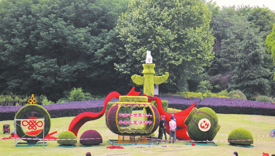 ? ? ?今年尋根節,我市計劃在市委廣場、政府辦公樓北坡等13個節點擺花70多萬盆,營造濃濃的節日氛圍。圖為園林工人正在政府辦公樓北坡扎花布景。
