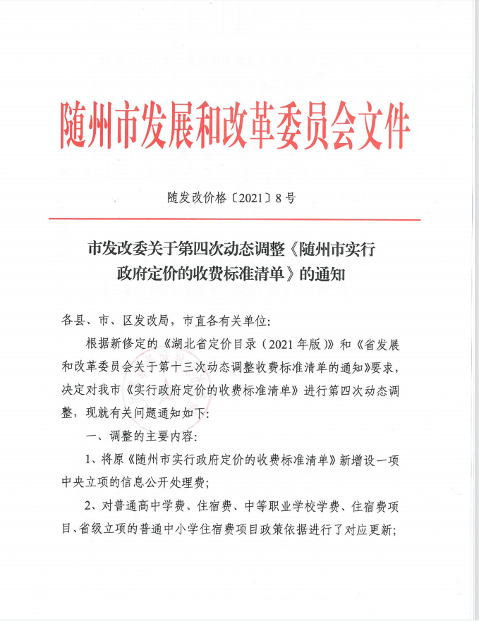 市發(fā)改委關于第四次動態(tài)調整《隨州市實行政府定價的收費標準清單》的通知
