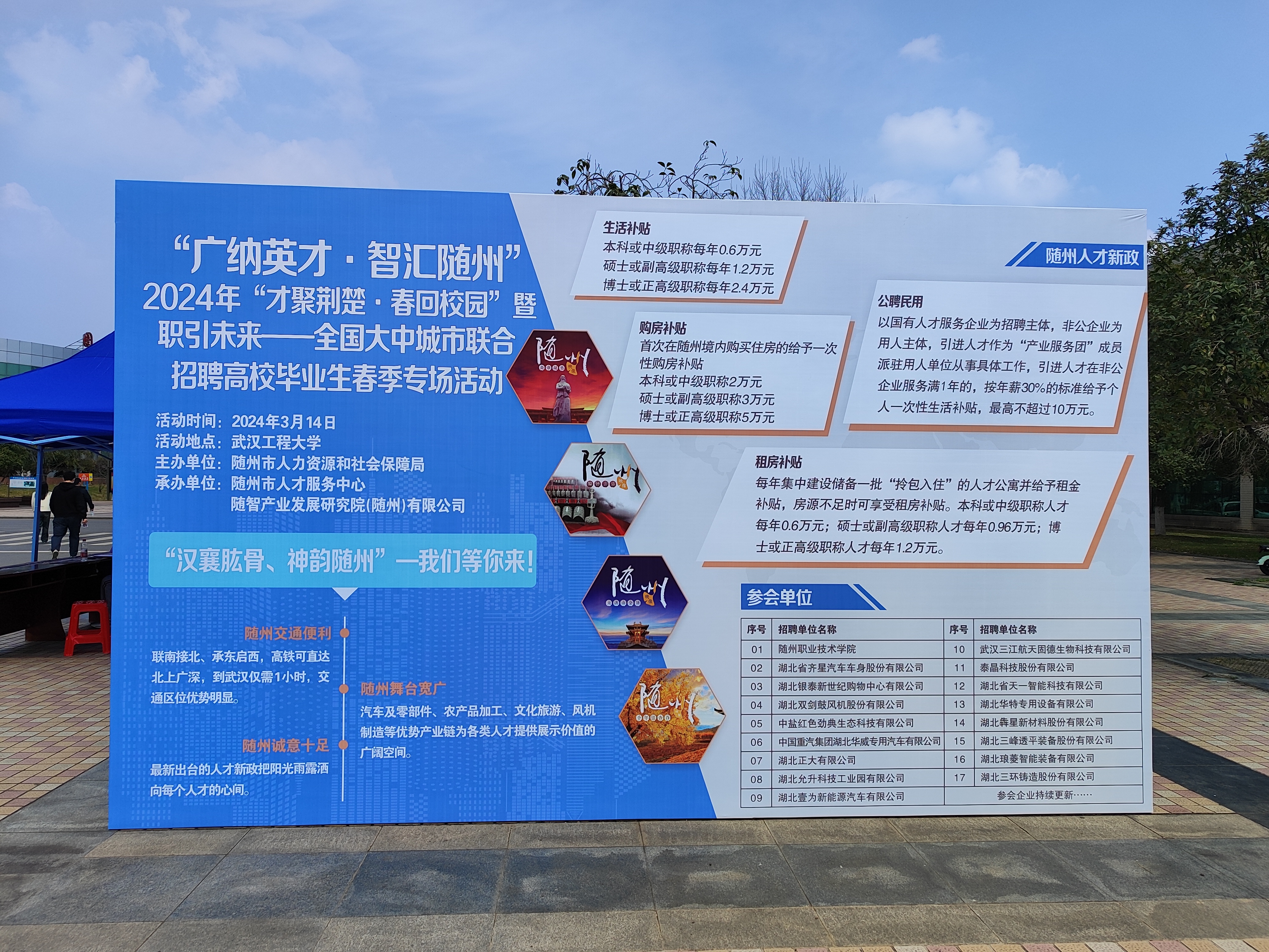 3月13日至14日,由隨州市人社局主辦,隨州市人才服務中心、隨智產業發展研究院(隨州)有限公司聯合承辦的“廣納英才?智匯隨州”2024年“才聚荊楚?春回校園”暨職引未來——全國大中城市聯合招聘高校畢業生春季專場活動在湖北工業大學、武漢科技大學和武漢工程大學舉行,隨州市18家重點企業赴漢高校參加。本次校園招聘會上,湖北省齊星汽車車身股份有限公司、中國重汽集團湖北華威專用汽車有限公司、湖北犇星新材料股份有限公司、泰晶科技股份有限公司、湖北茂盛生物有限公司等隨州重點企業提供了儲備干部、財務、銷售、市場策劃、研發、證券分析等崗位。