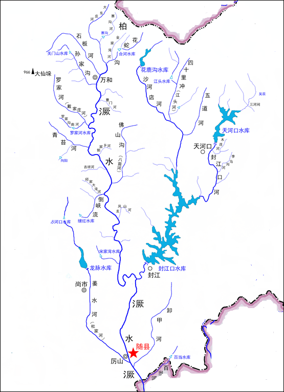 ?水,發(fā)源于太白頂景區(qū)王店村桐柏山南麓鷹子咀,為府澴河上游一級(jí)支流,流經(jīng)太白頂景區(qū)、萬和鎮(zhèn)、尚市鎮(zhèn)、厲山鎮(zhèn),于縣經(jīng)濟(jì)開發(fā)區(qū)出境,境內(nèi)河流長約90.3千米。