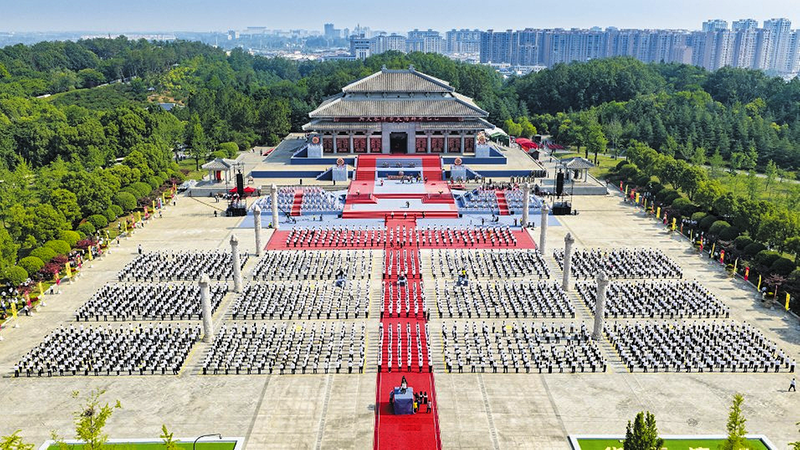 唱誦始祖。身著56個民族服飾的炎黃子孫唱響《炎帝大歌》,頌揚炎帝精神的贊歌回蕩在烈山之上。