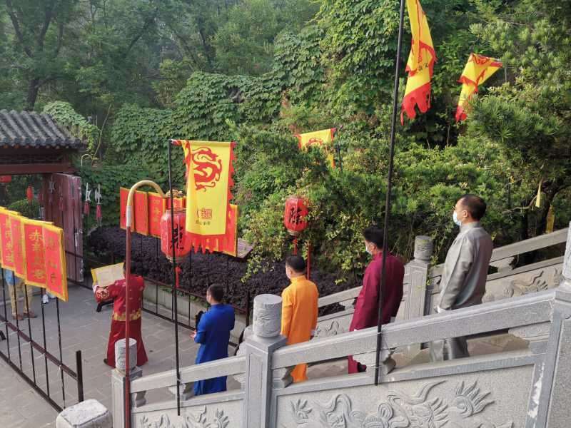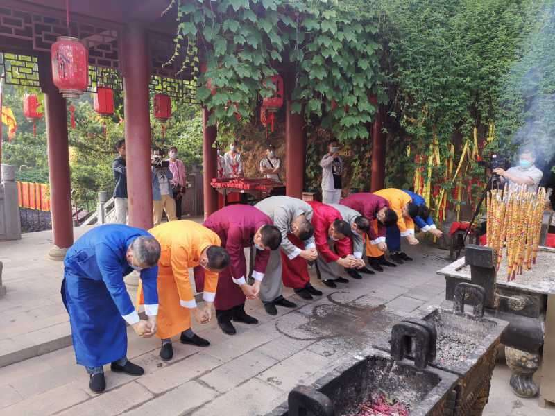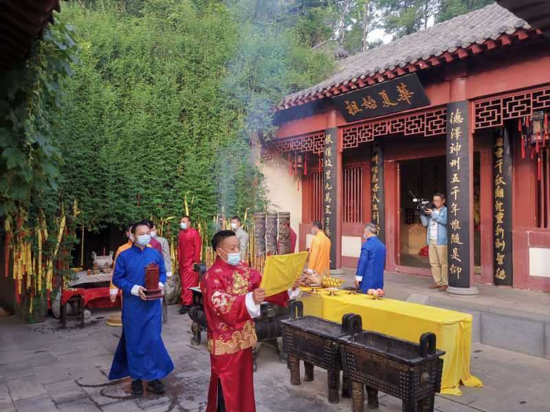 5月17日上午,庚子年炎帝文化廟會舉行請圣儀式。在大司儀的主持下,由九名司禮組成的請圣隊伍依次凈手、上貢品、上高香、敬酒之后,行三叩九拜大禮。
