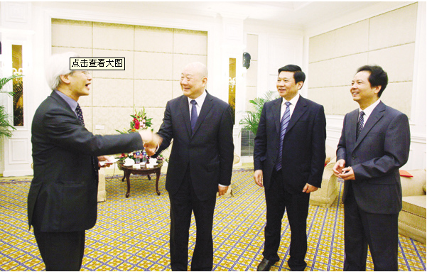 5月15日下午,副省長田承忠(左二)、市委書記王祥喜(右二)、市長劉曉鳴(右一)會見參加尋根節的海內外嘉賓。圖為會見香港特區政府代表吳偉堂(左一)。