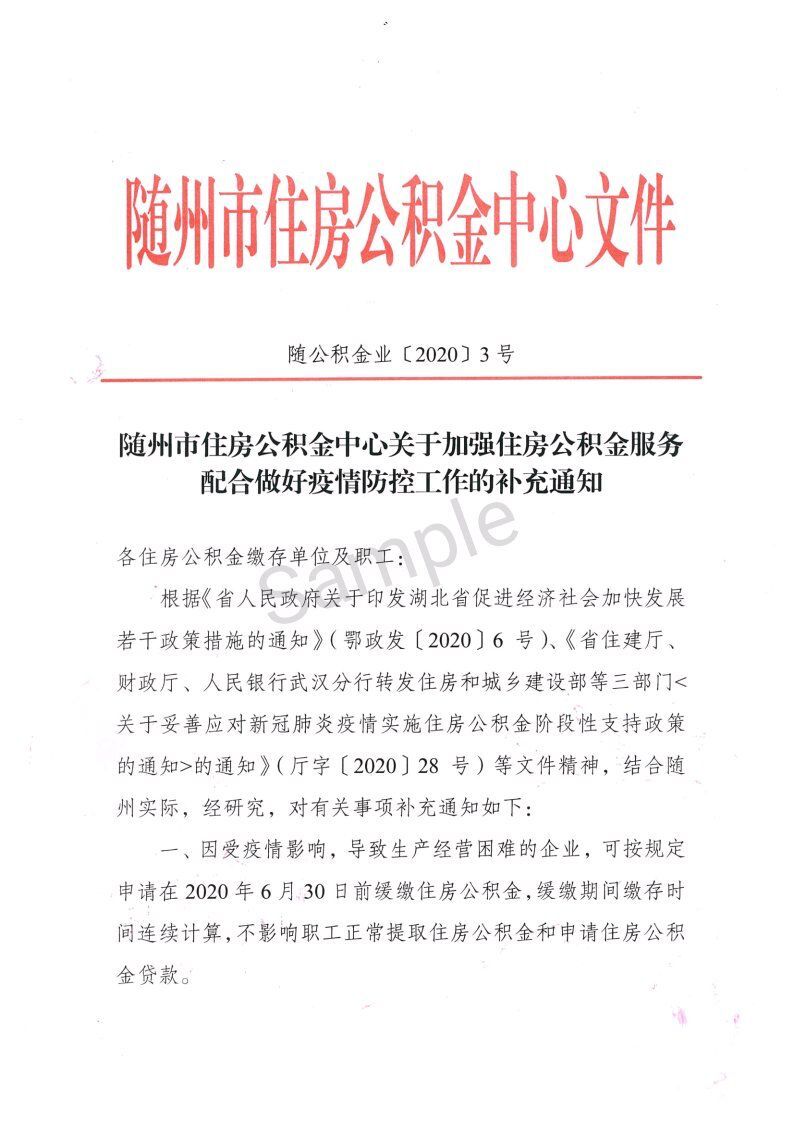 隨州市住房公積金中心關于加強住房公積金服務配合做好疫情防控工作的補充通知