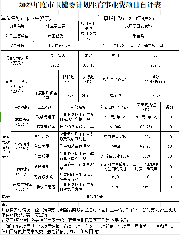 《2023年度市衛健委計劃生育事業費項目自評表》附后