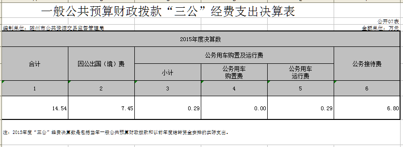 2015年我局預算單位“三公”經費公共預算財政撥款支出15.27萬元,其中:公務用車運行維護費1.02萬元,比上年下降2.52萬元;公務接待費6.8萬元,總共接待81批次,接待人數800人,比上年上升6.1萬元;出國考察費 7.45萬元,出國2團,人數2人,比上年增加7.45萬元。沒有公務車購置。已經對本部門開展了真實性抽查。