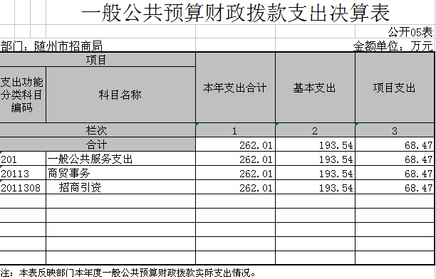 2015年度財政撥款收入支出總計262.01萬元,與上年相比減少39.46萬元,主要原因是2015年招商活動、招商經費減少。