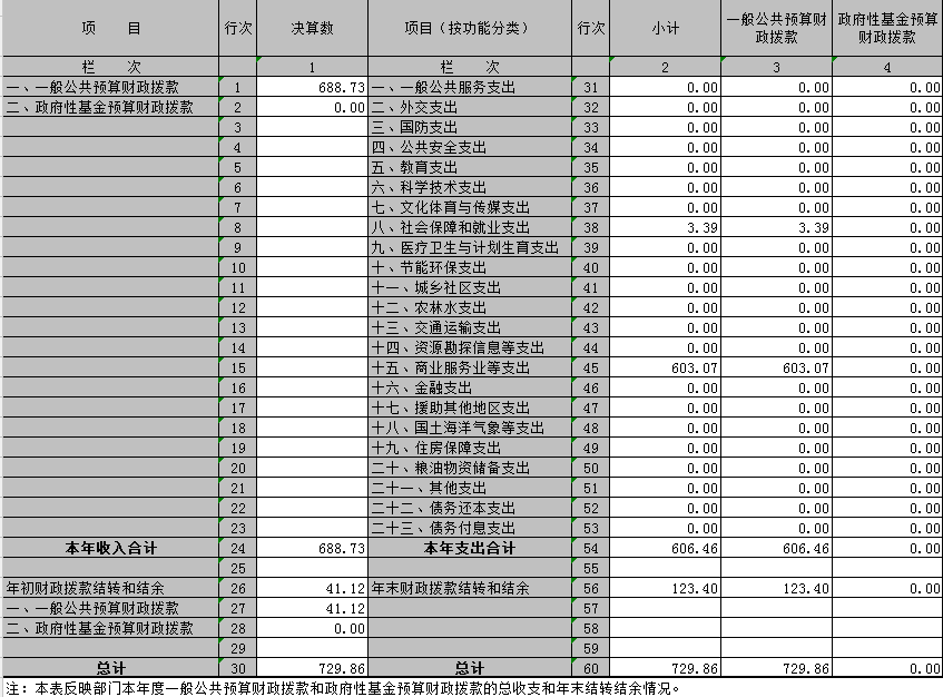 2015年收入共計688.73萬元,其中基本支出為216.06萬元,項目支出472.68萬元,2014年年末結轉結余資金41.12萬元。本年支出合計606.46萬元,其中基本支出216.06萬元,項目支出390.40萬元,年末結轉和結余資金合計123.40萬元。