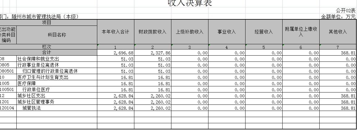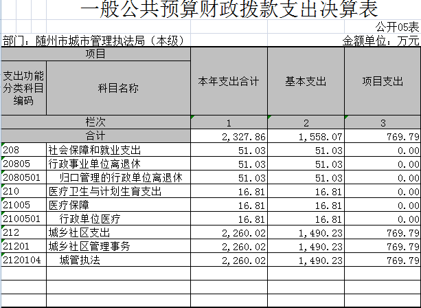 隨州市城市管理綜合執法局(以下簡稱市城管局),為政府直管正處級事業單位,局機關編制16名,實有人員12名。其中局長1名,副局長3名,工會主席1名,內設辦公室、督查考評科、執法監督科、業務管理科(行政審批科)、政工人事科等5個科室。