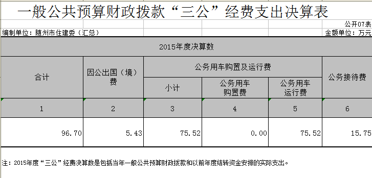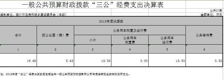 2015年隨州市住房和城鄉建設委員會一般公共預算財政撥款“三公”經費支出決算共計19.48萬元。其中:因公出國(出境)1批次,1人,經費共計5.43萬元,由于上年沒有安排人員出國(出境),因公出國(出境)支出有所增加;公務用車5輛,購置及運行費共計13.53萬元,較上年有較大增幅,其原因是2015年市住建委承擔了全市重點工程項目總量的60%,需要對各個重點工程進展情況進行督辦,巡查;公務接待2次,共計10人,費用0.52萬元,按照中央八項規定嚴格規范公務接待,比上年下降53%。