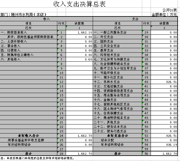 1、2016年度收支情況。隨州市水利局(本級)2016年部門收入1662.7萬元,其中財政撥款收入1662.1萬元,其他收入0.6萬元。部門全年支出826.51萬元,其中基本支出587.21萬元,項目支出239.3萬元;基本支出中工資福利支出386.52萬元,對個人和家庭補助支出116.69萬元,商品和服務支出74.88萬元,其他資本性支出9.13萬元。年末結轉結余836.19萬元。