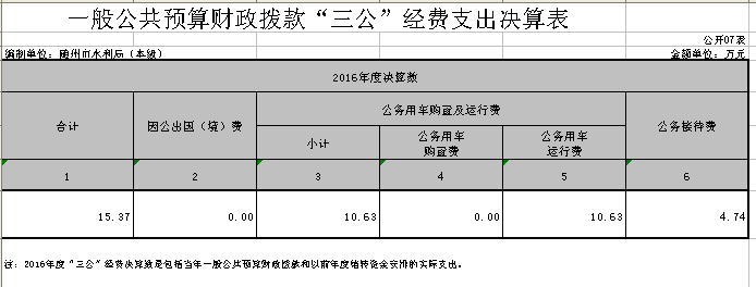 2、2016年“三公”經費情況。2016年隨州市水利局 “三公”經費合計15.37萬元,相較2015年17.14萬元,減少10.33%。具體 “三公”經費增減變化等說明如下: