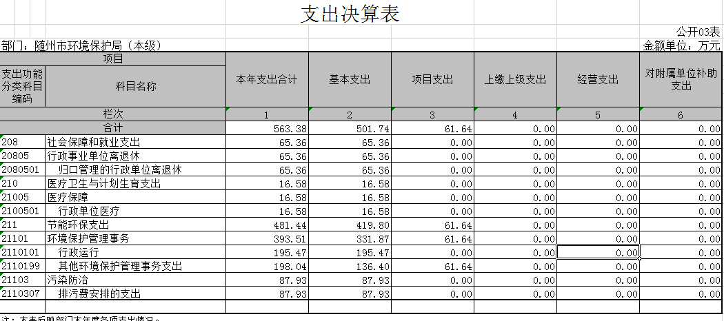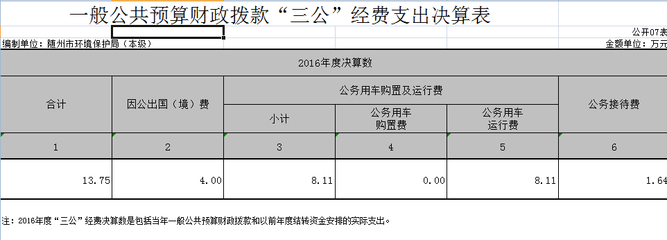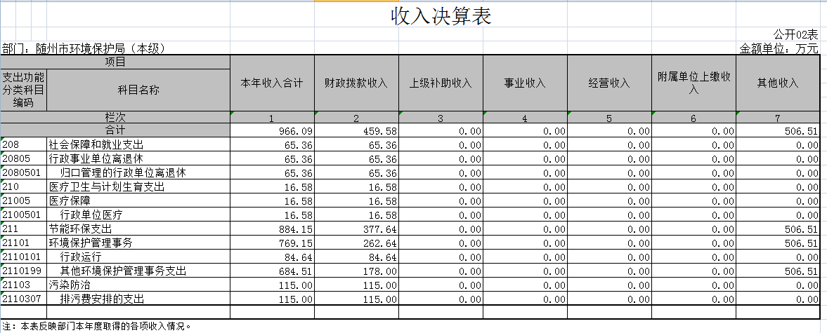 2016年決算收入合計966.09萬元,財政撥款收入459.58萬元。決算支出合計563.38萬元(基本支出501.74萬元,項目支出61.64萬元),其中行政運行195.47萬元,其他環境保護事務支出198.04萬元,社會保障及離退休65.36萬元,行政單位醫療16.58萬元,污染防治支出87.93萬元。
