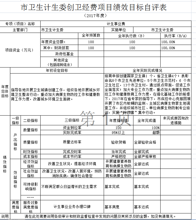 第四部分:2017年度部門決算表和部門整體支出、計生事業(yè)費項目經(jīng)費、創(chuàng)衛(wèi)項目經(jīng)費績效自評表