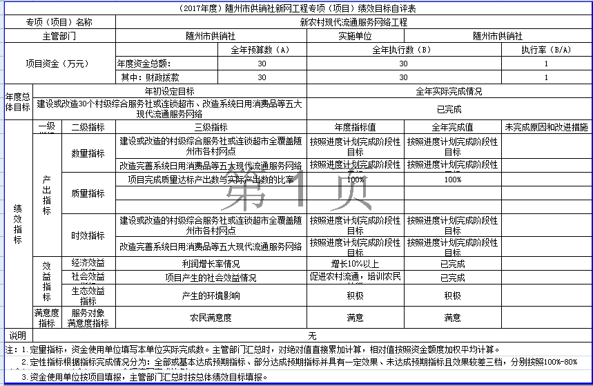 根據預算績效管理要求,我單位組織對2017年度一般公共預算項目支出全面開展績效自評,涉及項目1個,為新網工程項目,資金30萬元,占一般公共預算項目支出的100%。自評報告如下: