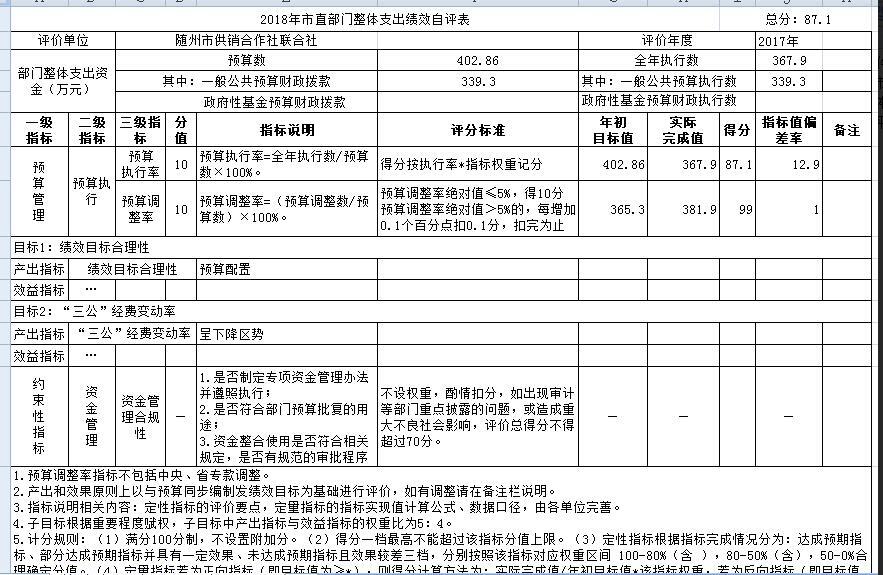 通過對我單位2017年度部門整體支出進行績效評價,經評價,整體支出績效評價總分為87.1分,評價結果類型為A,績效評價結果級別為優。具體情況如下: