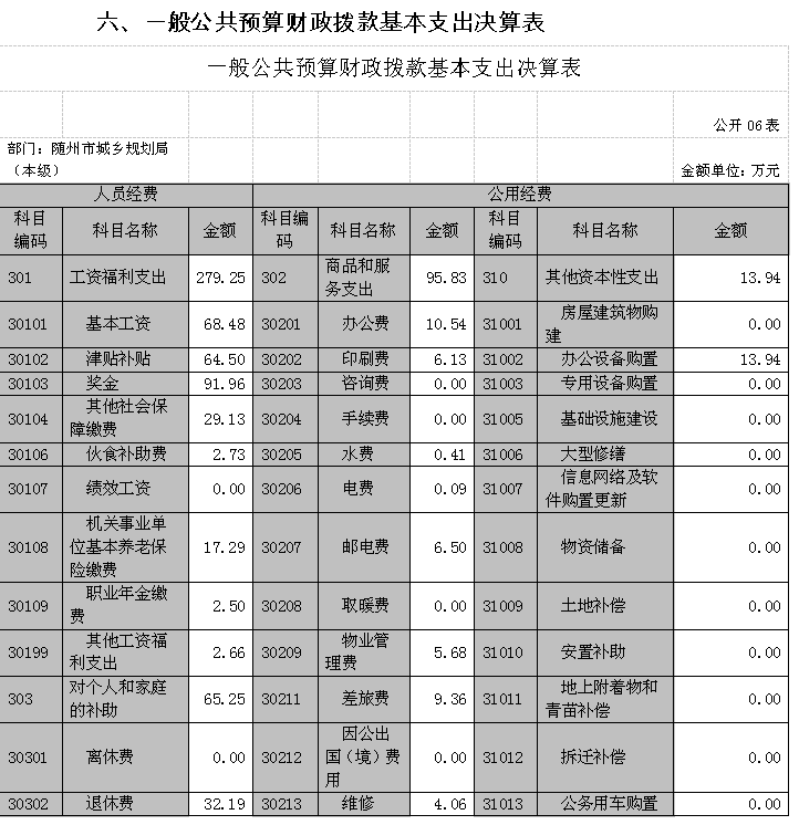 六、一般公共預算財政撥款基本支出決算表