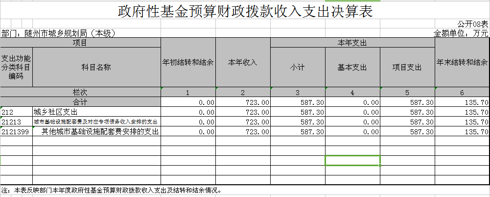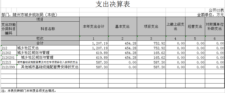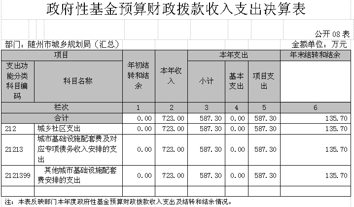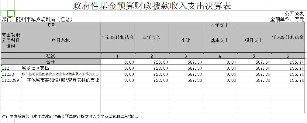 隨州市城鄉(xiāng)規(guī)劃局(本級)2017年初財政預算撥款支出1158.6萬元,財政撥款基本支出調整預算數1388.18萬元,決算數1207.19萬元,執(zhí)行率86.96%;一般公共財政預算撥款調整預算數665.18萬元,決算數619.89萬元,執(zhí)行率93.19%;政府性基金預算財政撥款調整預算數723萬元,決算數587.3萬元,執(zhí)行率81.23%,差異原因為指標結余結轉統(tǒng)籌后撥回。