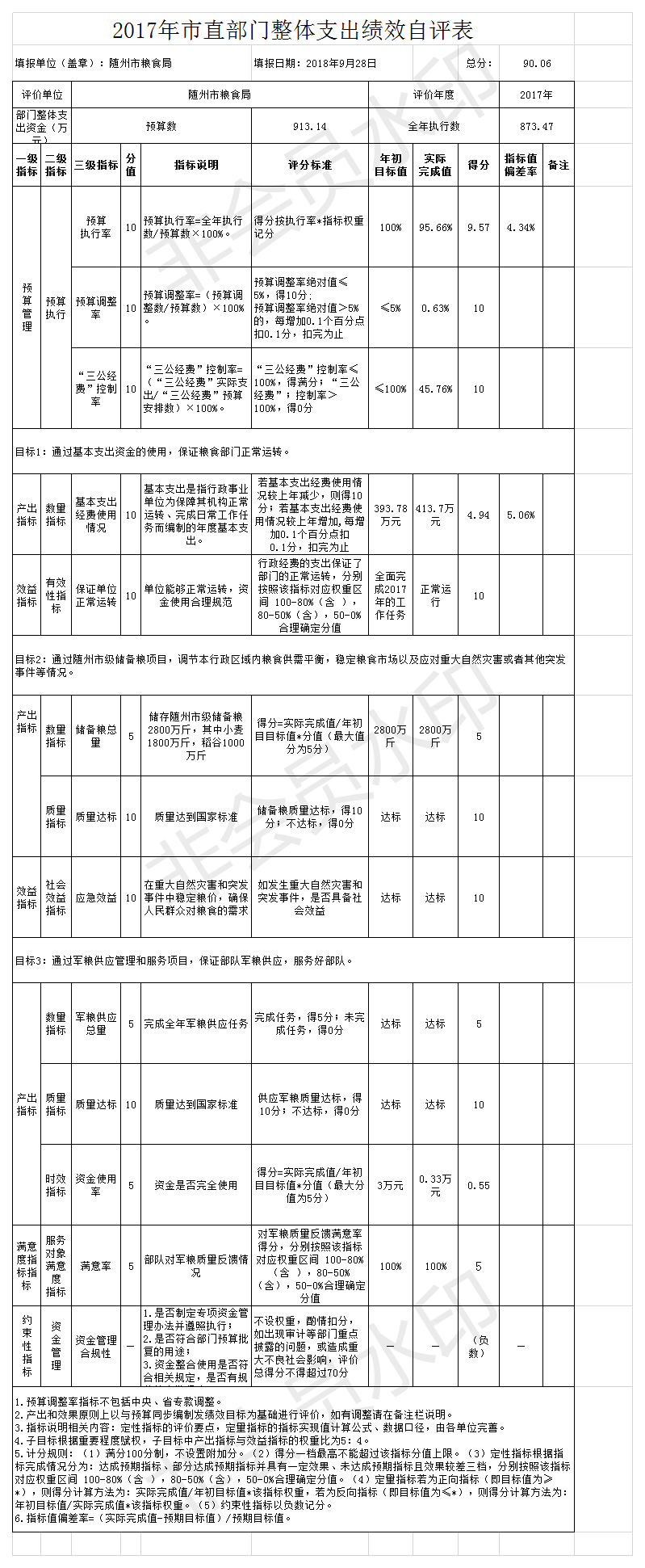 根據《2017年市直部門整體支出績效自評表》中績效指標分析評分,隨州市糧食局2017年部門整體支出績效自評得90.06分,績效等級為優。