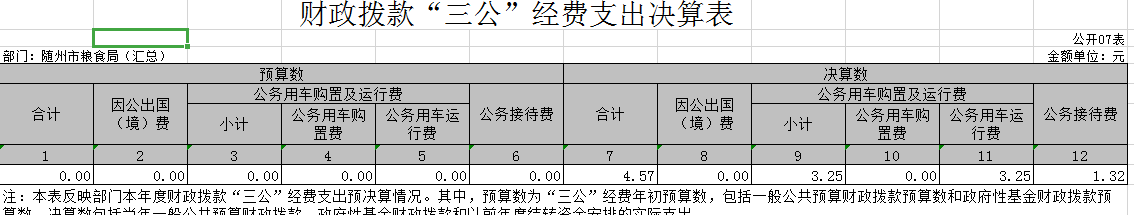 隨州市糧食局(匯總)2017年財政撥款“三公”經費支出4.57萬元,比年初預算減少2.35元,減少33.96%,主要原因是:局機關及二級單位嚴格控制經費開支,年初財政撥款預算因公出國(境)費用1.5萬元,2017年度實際未開支;比上年支出增加4.54 元,主要原因是: 2016年度財政資金撥款不足,三公經費開支大多數用其他收入支付。其中:
